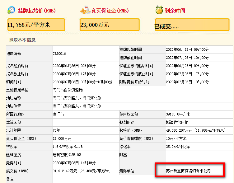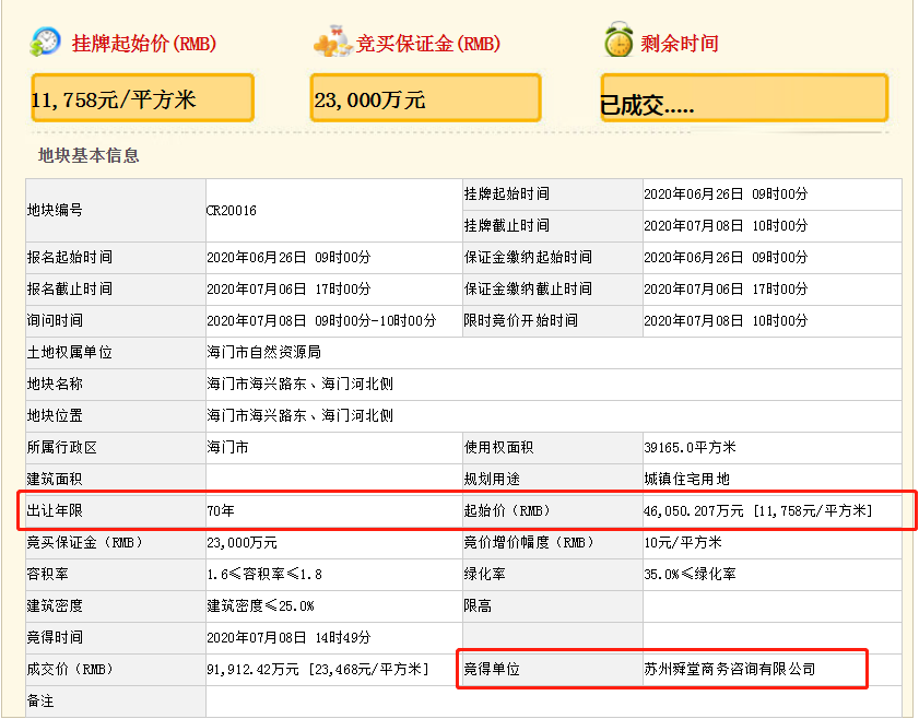 最终,14:45:25,历时近5小时,鏖战465轮后,苏州舜堂商务咨询有限公司以总价9.19亿,楼面价13037.7元/㎡,溢价率99.59%的成绩拿下该地块。