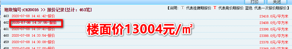 下午14:37:55,历时462轮加价,该地块楼面价正式破1.3万/㎡,达到了13004元/㎡,溢价率99%