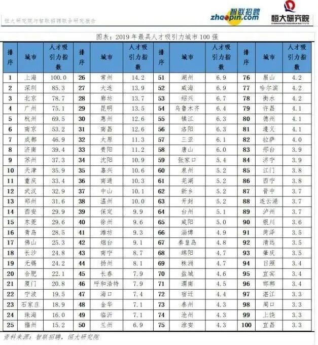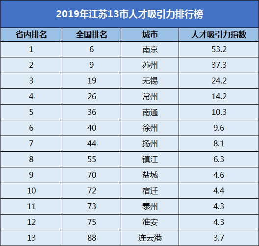 前段时间,恒大研究院和智联招聘发布了《中国城市人才吸引力排名2020》。报告显示,2019年最具人口吸引力100强中,上海、深圳、北京位居前三。必须要提的是,江苏13市全部榜上有名。