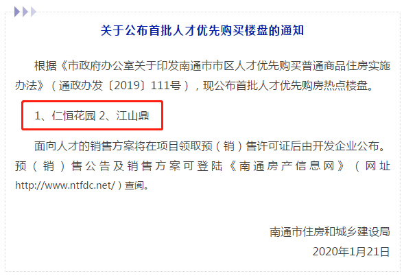 今年初,南通市公布首批人才优先购房热点楼盘,分别是仁恒公园世纪、江山鼎。