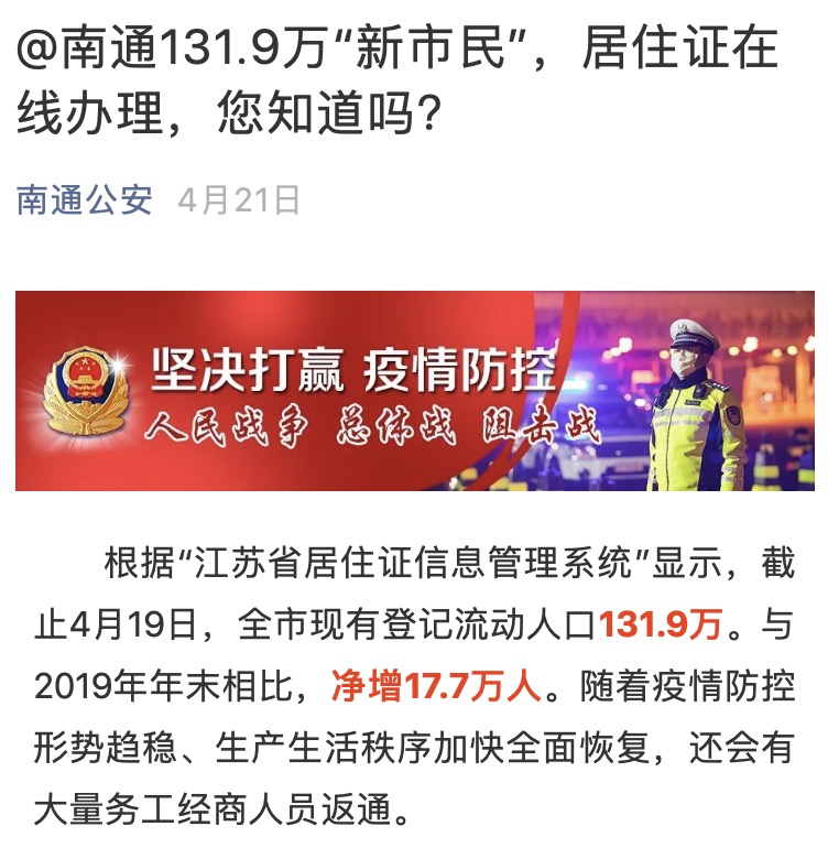 前一段时间,江苏省南通市公安局官方微信号发布消息称,据最新统计,南通现有登记流动人口数已突破130万,相比去年(2019年)年末净增了17.7万人。