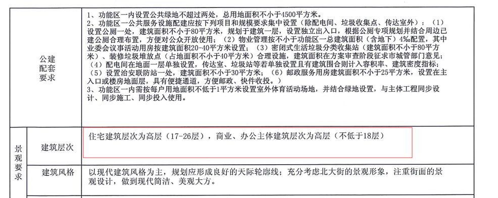 此外,住宅建筑层侧为高层(17-26层),商业、办公主体建筑层侧为高层(不低于18层)