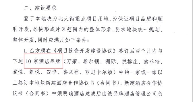 1、地块内需建设运营建面不低于32000㎡的五星级酒店一座,且须至少引入万豪、希尔顿、洲际、悦榕庄、索菲特、君悦、凯悦、四季、喜来登、丽思卡尔顿,10家酒店品牌中的一家;