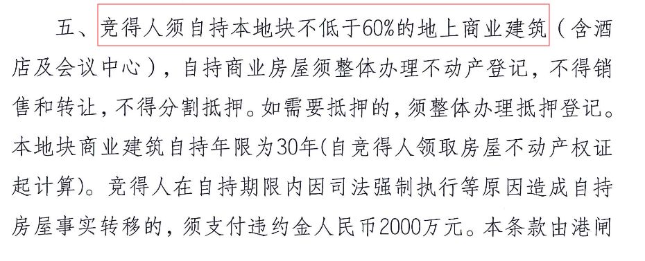 值得注意的是,竞得人须自持本地块不低于60%的地上商业建筑(含酒店及会议中心),自持商业房屋须整体办理不动产登记,不得销售和转让,不得分割抵押。