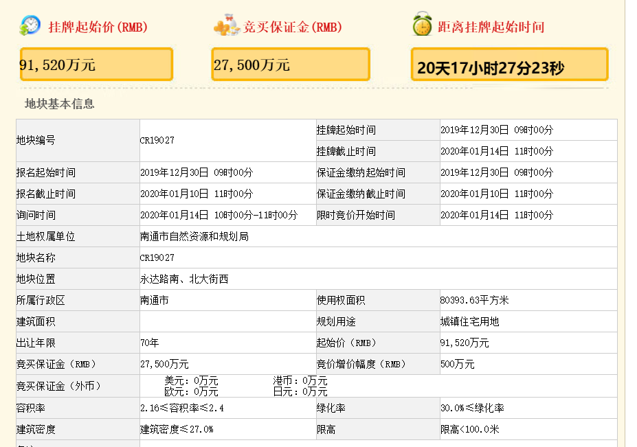 该地块编号为CR19027,地块位于永达路南、北大街西,地块面积为80393.63㎡,容积率2.16-2.4,地块起拍单价为11383.99元/㎡,起拍楼面价为4743.33元/㎡,该地块预计于预计1月14日出让。