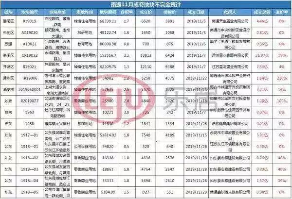临近岁末,南通迎来一轮土拍热潮! 刚刚过去的11月中,据土拍大数据统计,南通市11月份共成交18宗经营性建设用地,总出让面积达77.97万㎡,总成交金额达48.76亿元,相比十月呈现价涨量跌趋势! 其中住宅类地块占9宗,总出让面积达44.45万㎡,总成交金额达42.29亿元,其中最高楼面价为9388元/㎡,由星湖置业揽下南通市开发区能达板块R19023地块所创。 图源来自乐居南通 重点地块竞价激烈,看点十足!比如港闸区CR19022地块42轮报价后溢价18%成交、某房产公司7.53亿摘牌开发区重点地块。 再看看被称之为“土拍月”的12月,土拍大战已渐渐拉开帷幕,一触即发,看点颇多!其中不乏港闸、发区的重磅地块,最高起拍楼面价为11072元/㎡! 南通土拍热起来了!将有哪些重磅地块即将入市,我们先一睹为快! 112.48亿元!48宗地块待出让 12月重磅地块迭出,南通似乎再次迎来了“土拍月”。据统计,1南通市区及区县有48宗经营性地块挂牌出让。 从地块分布来看,南通市区占3宗,通州区(包含通州湾)占10宗,海门市占5宗,启东市占15宗,如皋市占2宗,海安市占3宗,如东县占10宗,总出让面积为228.08万㎡,总起始金额为112.48亿元,起拍楼面价最高11072元/㎡。 图源来自土拍网 重点地块剖析 正在被改写的南通房价 1. 港闸王炸地块来袭,起拍楼面价11072元/㎡ 地块位置:港闸区永怡路南、友谊路东侧 出让面积:44090.58㎡ 规划用地性质:城镇住宅 容积率:1.49≤R≤1.66 起拍楼面地价:11072元/㎡ 竞拍时间:12月23日 根据地块出让公告,该地块如果成交土地单价≥23900元/㎡且<26660元/㎡,即溢价率达到30.03%,则需要在2020年2月21日前付清出让金余款,工程结构封顶后方可申请预售许可。 如果成交土地单价≥26660元/㎡,即溢价率达到45.05%,该地块需要在2020年1月22日前付清出让金余款, 实行现房销售。 图源来自南通市政府 2. 能达商务区最后一宗宅地重磅上架,起拍楼面价8473元/㎡ 地块位置:东方大道西、同仁路南 出让面积:75899.57㎡ 规划用地性质:居住用地 容积率:1.79≤容积率<2.2 起拍楼面地价:8473元/㎡ 竞拍时间:12月26日 该地块西侧为规划中的能达中学,南侧为思德福国际学校,不远处星湖小学、能达生态长廊等,周边各项配套已经基本完善。 图源来自土拍网 根据出让要求,如果成交土地单价≥24240元/㎡且小于27030元/㎡,即R19025地块溢价率达到30.04%,则该地块需要工程结构封顶后方可申请预售许可。 如果成交土地单价大于或等于27030元/㎡,即溢价率达到45.01%,则需要实行现房销售。 图源来自土拍网 3. 叠石桥再挂新地块,靠近国际家纺城(志浩市场) 地块位置:川姜镇金浩路西侧、温州路北侧地块 出让面积:73942㎡ 规划用地性质:居住用地 容积率:1.6-1.8 起拍楼面地价:3889元/㎡ 竞拍时间:12月9日 有消息称:该宗地块是目前通州所有待拍地块中较为靠近南通国际家纺城(志浩市场)的一宗宅地,因此也颇受关注! 图源来自土拍网 把握土地市场的供应情况不仅能把握楼市走向更能在一定程度上影响楼市发展,目前气氛较为低迷的房地产市场是否能在12月迎来一个漂亮的翻身让我们拭目以待!