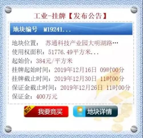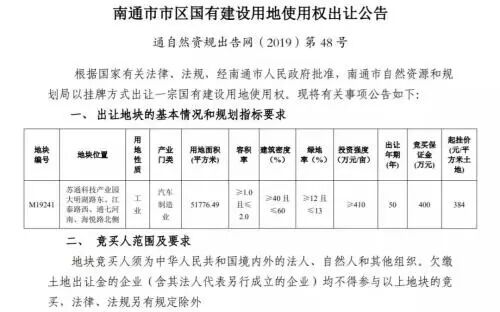 近日,南通自然资源和规划局发布了挂牌公告。其中,苏通园区推出了1宗汽车制造业用地,编号为M19241。